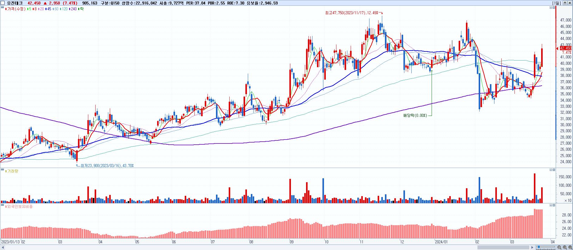 - 유진테크 (42,450원 ▲ 7.47% , 시총: 9,728억, 외국인 순매수 거래금:64억)