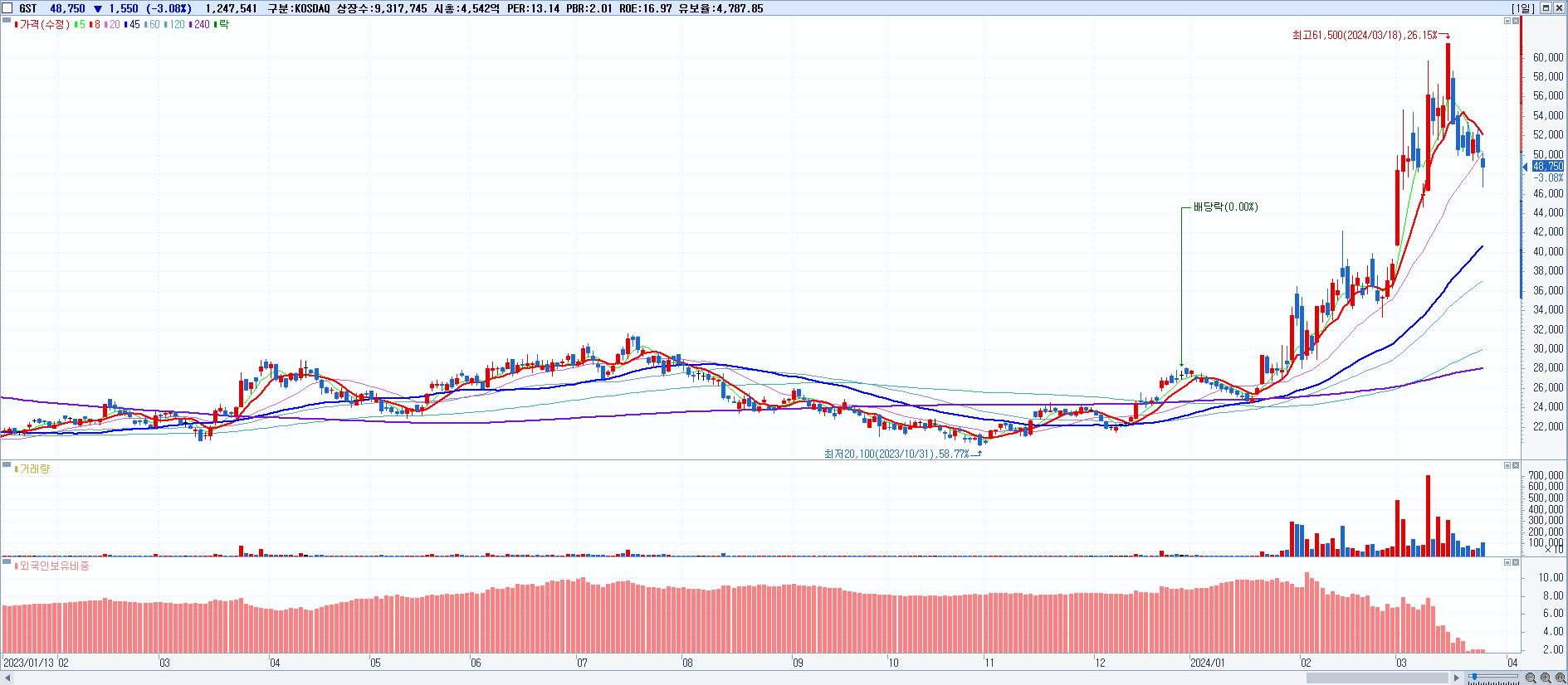 - GST (48,750원 ▼ -3.08% , 시총: 4,542억, 외국인 순매수 거래금:49억)