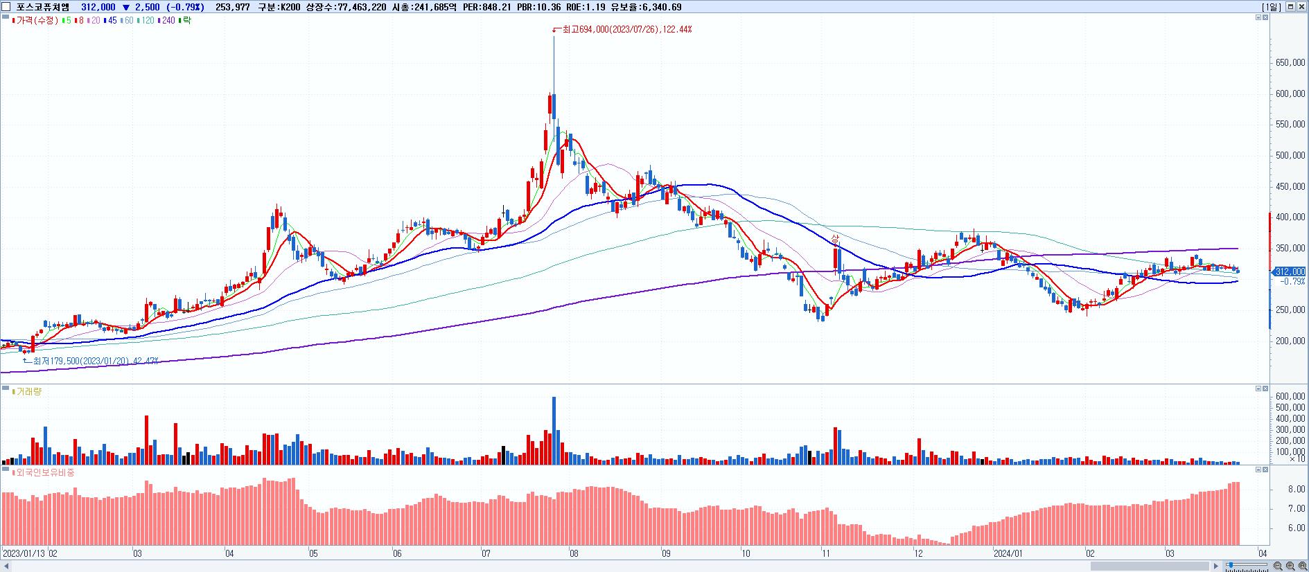 - 포스코퓨처엠 (312,000원 ▼ -0.79% , 시총: 241,685억, 외국인 순매수 거래금:45억)