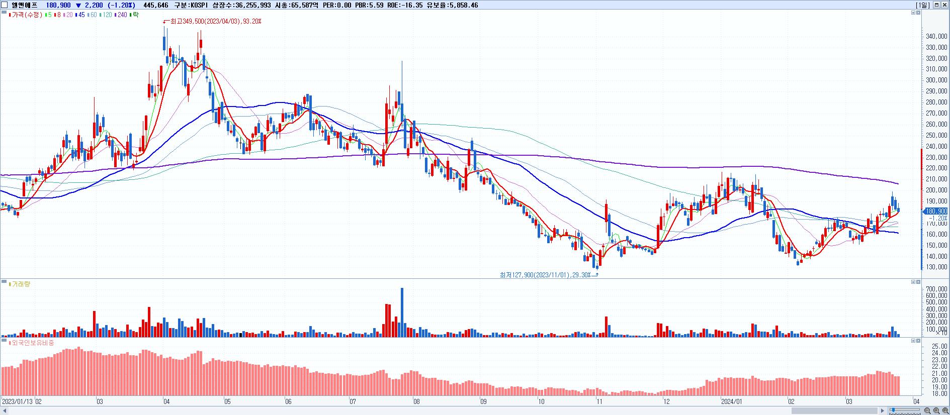 - 엘앤에프 (180,900원 ▼ -1.2% , 시총: 65,587억, 외국인 순매수 거래금:66억)