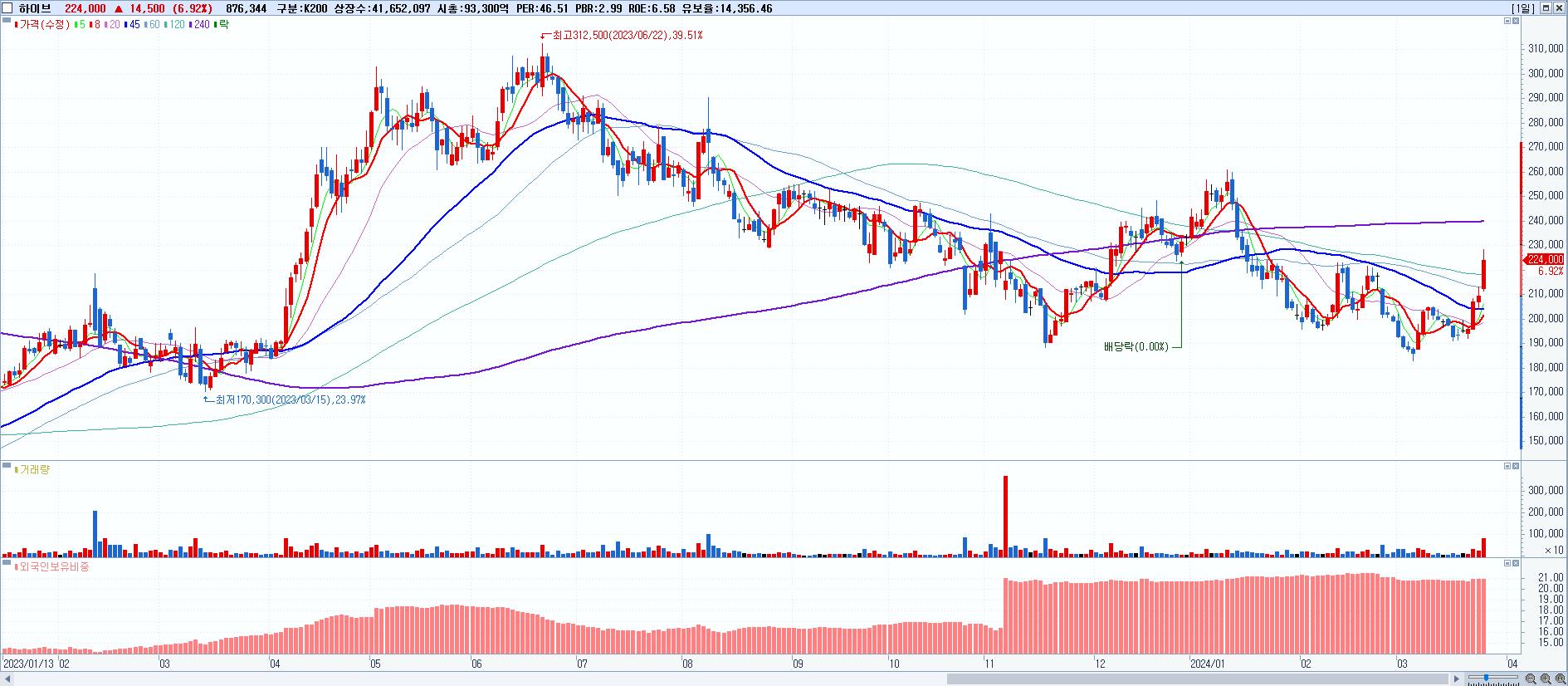 - 하이브 (224,000원 ▲ 6.92% , 시총: 93,301억, 외국인 순매수 거래금:108억)