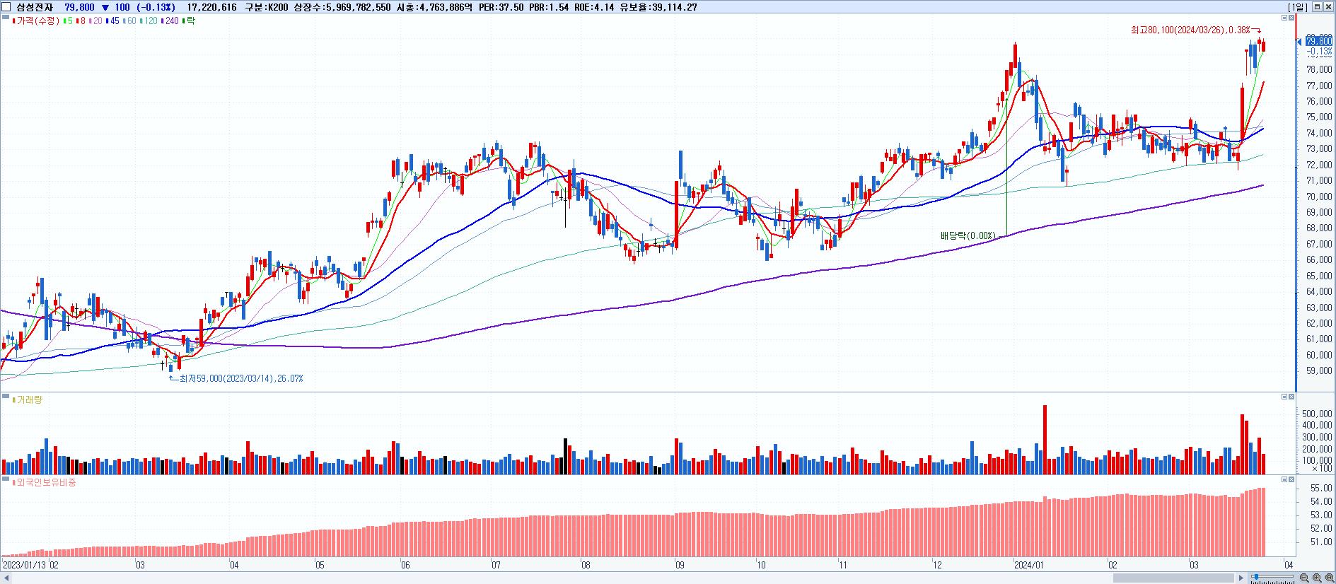 - 삼성전자 (79,800원 ▼ -0.13% , 시총: 4,763,886억, 외국인 순매수 거래금:59억)
