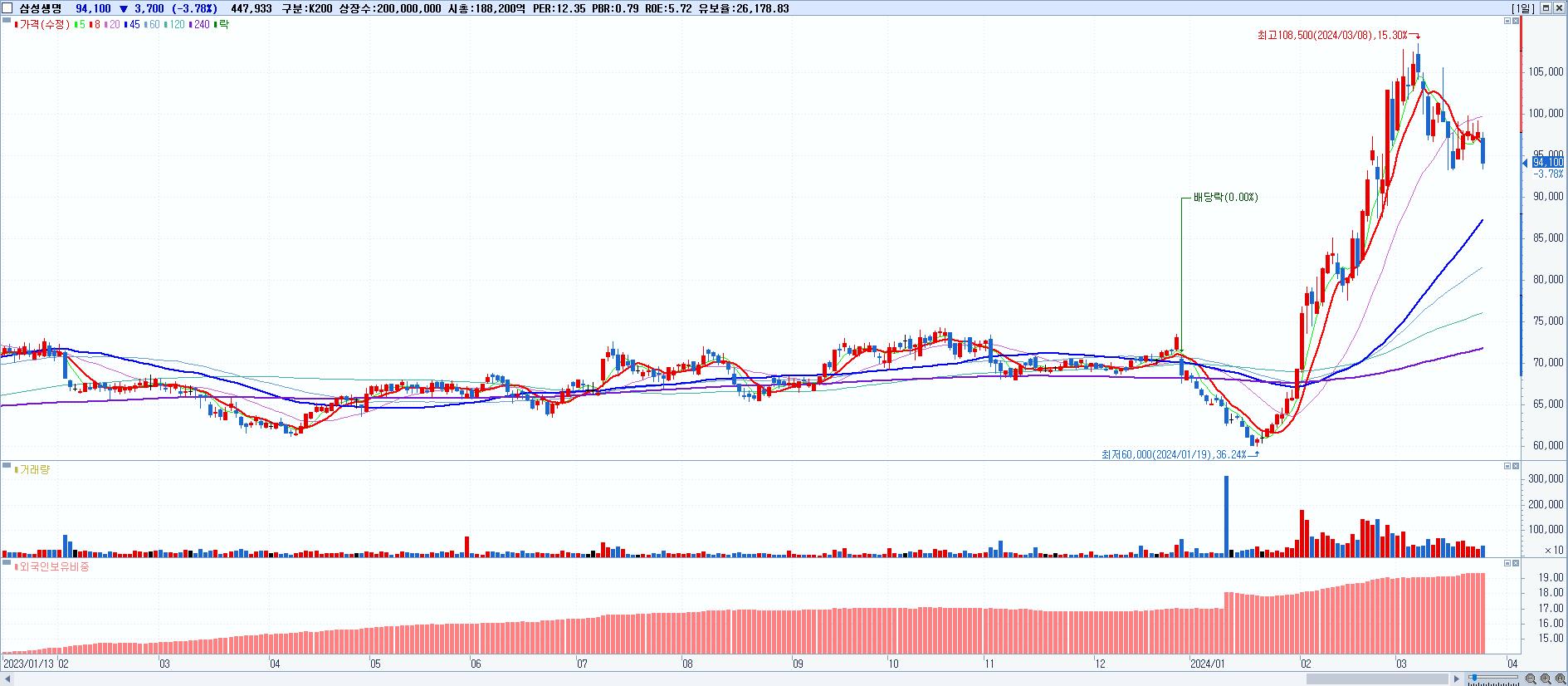 - 삼성생명 (94,100원 ▼ -3.78% , 시총: 188,200억, 외국인 순매수 거래금:124억)