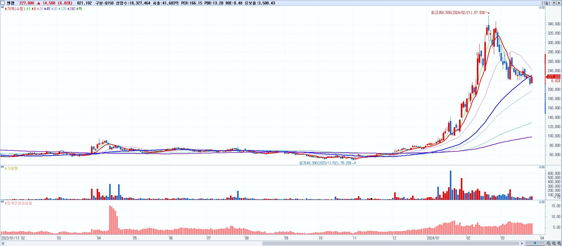- 엔켐 (227,000원 ▲ 6.82% , 시총: 41,603억, 외국인 순매수 거래금:58억)