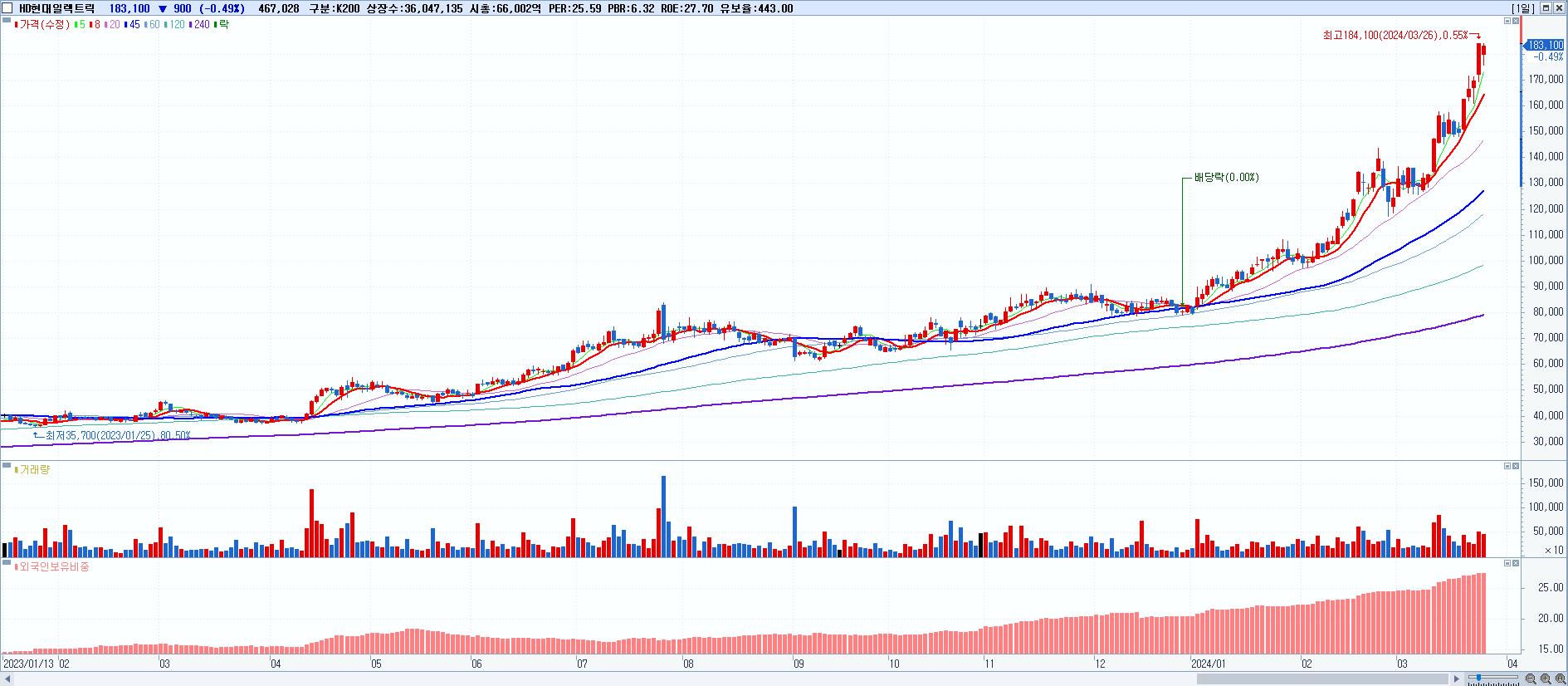 | 3월 27일 | 183,100원 | ▲ 24.56% | ▼ -0.49% | -38억 | 843억 |