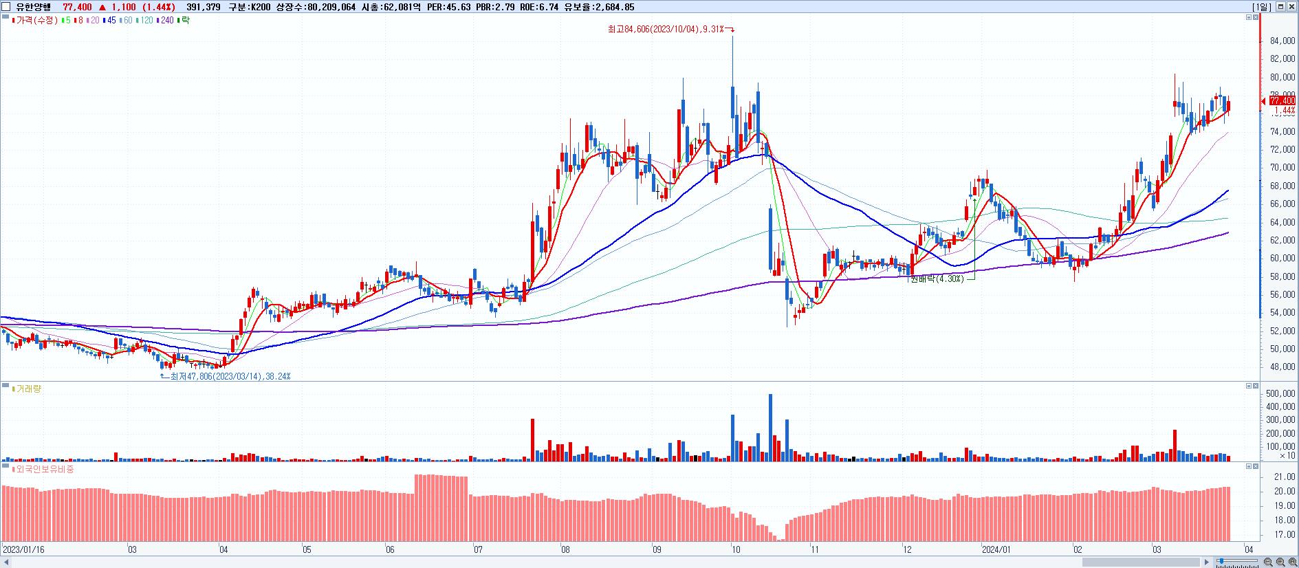 - 유한양행 (77,400원 ▲ 1.44% , 시총: 62,082억, 외국인 순매수 거래금:55억)
