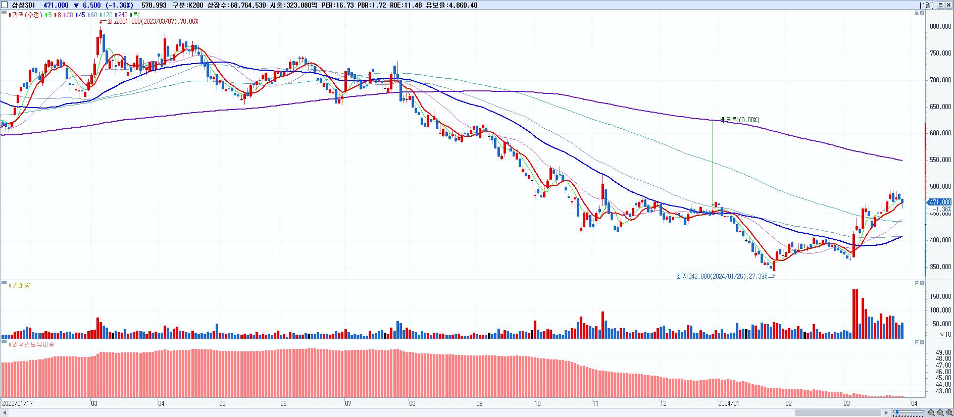 - 삼성SDI (471,000원 ▼ -1.36% , 시총: 323,881억, 외국인 순매수 거래금:179억)
