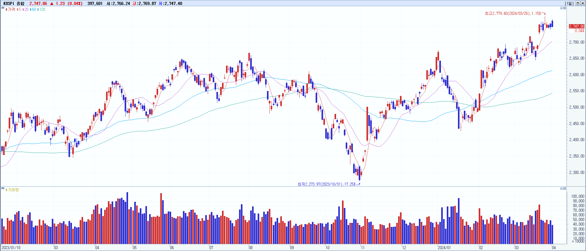 | 04/01 | 2,747.86 | ▲0.04% | -3,149억 | 2,683억 | 247억 | 219억 |