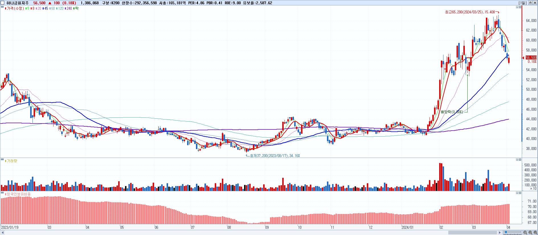 - 하나금융지주 (56,500원 ▲ 0.18% , 시총: 165,181억, 외국인 순매수 거래금:71억)