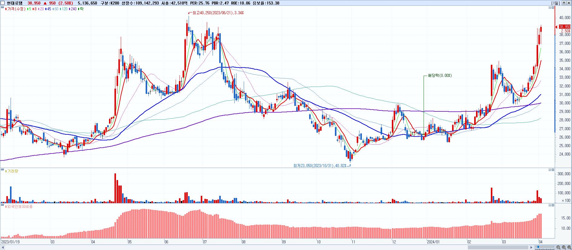 - 현대로템 (38,950원 ▲ 2.5% , 시총: 42,511억, 외국인 순매수 거래금:273억)