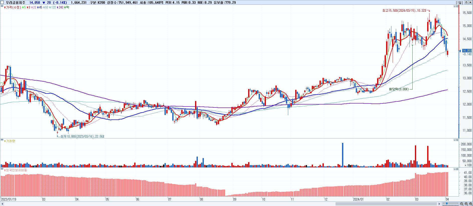 - 우리금융지주 (14,050원 ▼ -0.14% , 시총: 105,649억, 외국인 순매수 거래금:65억)