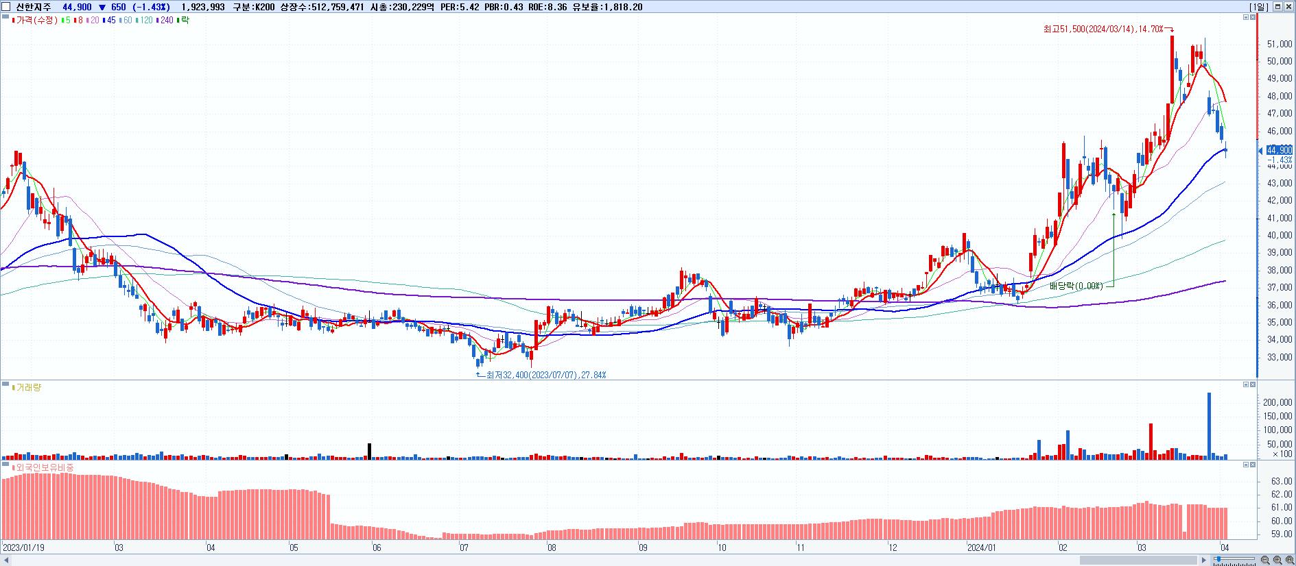 - 신한지주 (44,900원 ▼ -1.43% , 시총: 230,229억, 외국인 순매수 거래금:89억)