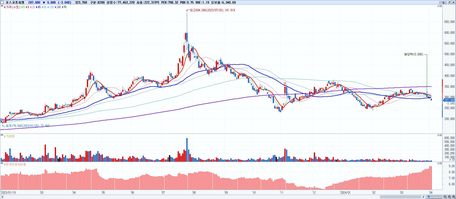 - 포스코퓨처엠 (287,000원 ▼ -3.04% , 시총: 222,319억, 외국인 순매수 거래금:120억)