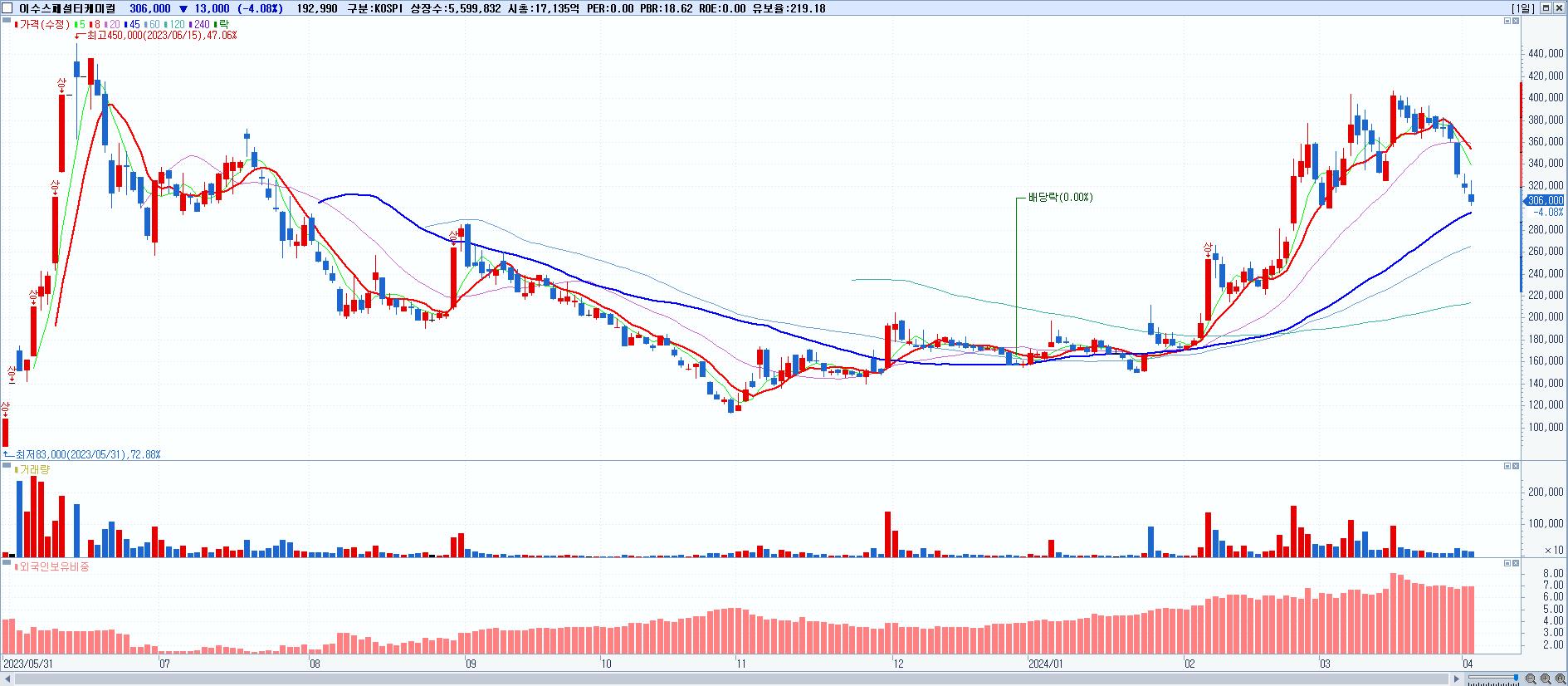 - 이수스페셜티케미컬 (306,000원 ▼ -4.08% , 시총: 17,135억, 외국인 순매수 거래금:95억)
