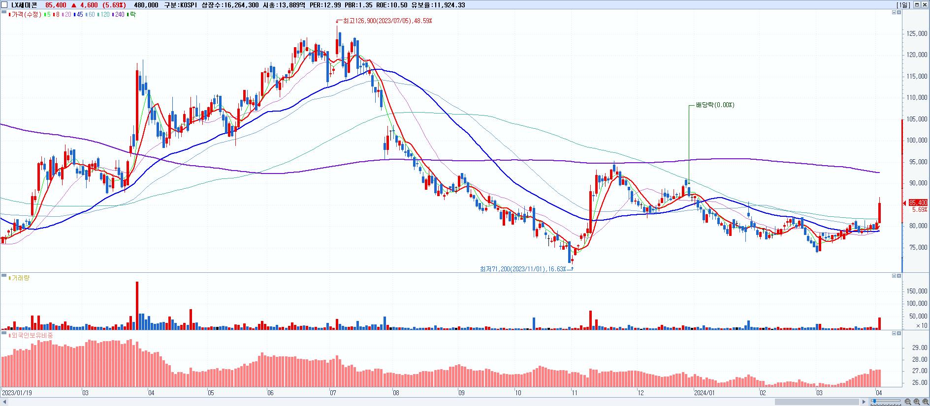 - LX세미콘 (85,400원 ▲ 5.69% , 시총: 13,890억, 외국인 순매수 거래금:54억)
