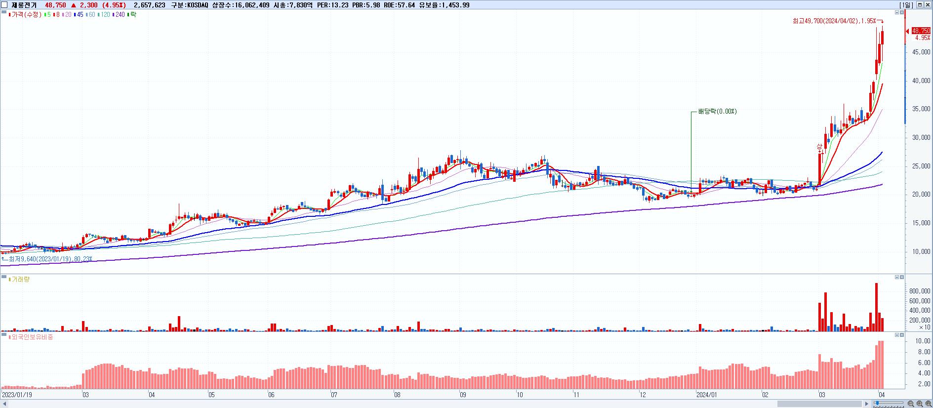 - 제룡전기 (48,750원 ▲ 4.95% , 시총: 7,830억, 외국인 순매수 거래금:53억)
