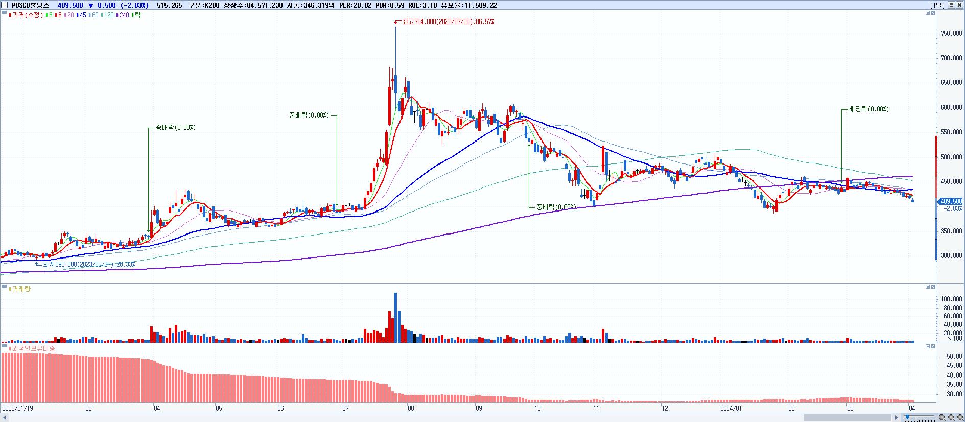 - POSCO홀딩스 (409,500원 ▼ -2.03% , 시총: 346,319억, 외국인 순매수 거래금:135억)