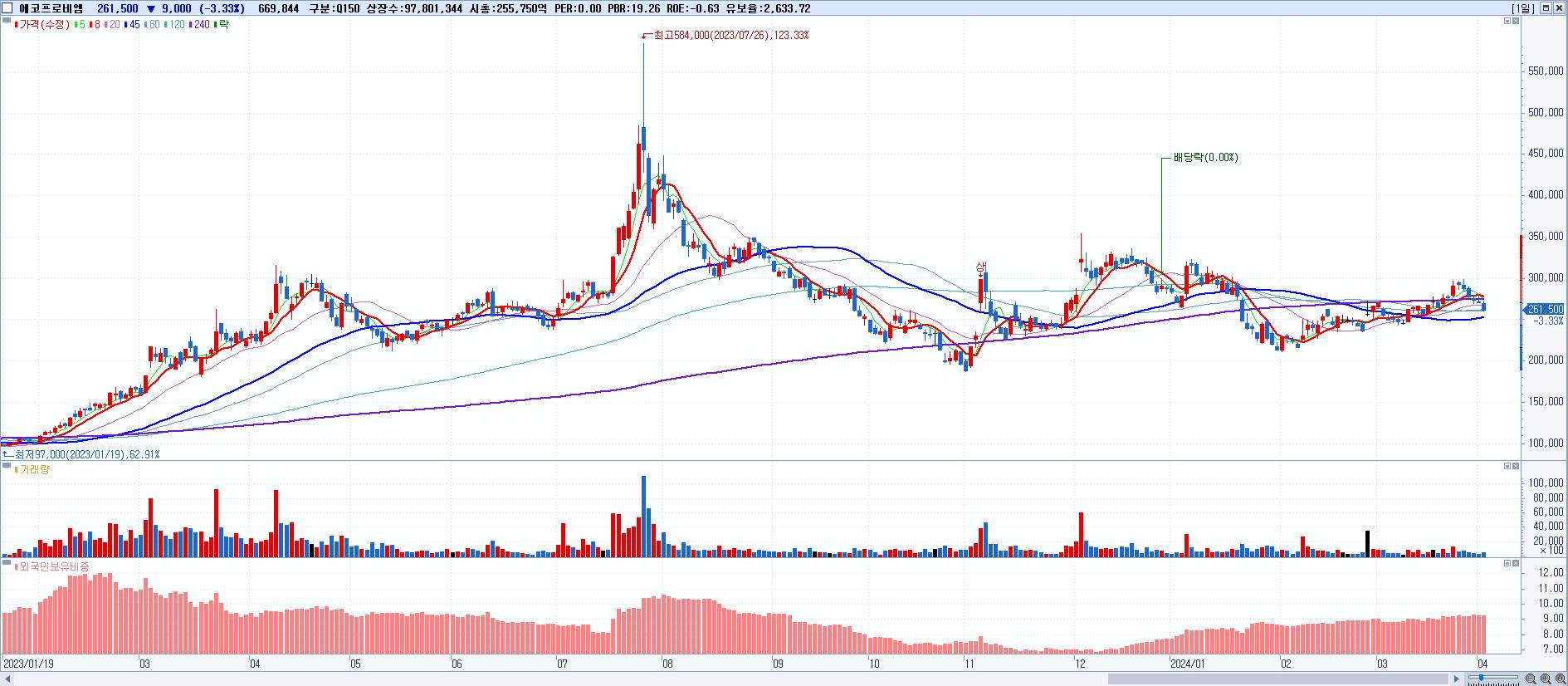 - 에코프로비엠 (261,500원 ▼ -3.33% , 시총: 255,751억, 외국인 순매수 거래금:90억)