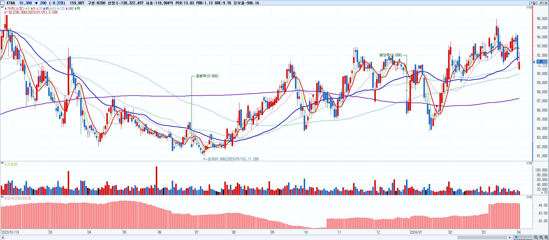 - KT&G (91,300원 ▼ -0.22% , 시총: 118,984억, 외국인 순매수 거래금:57억)