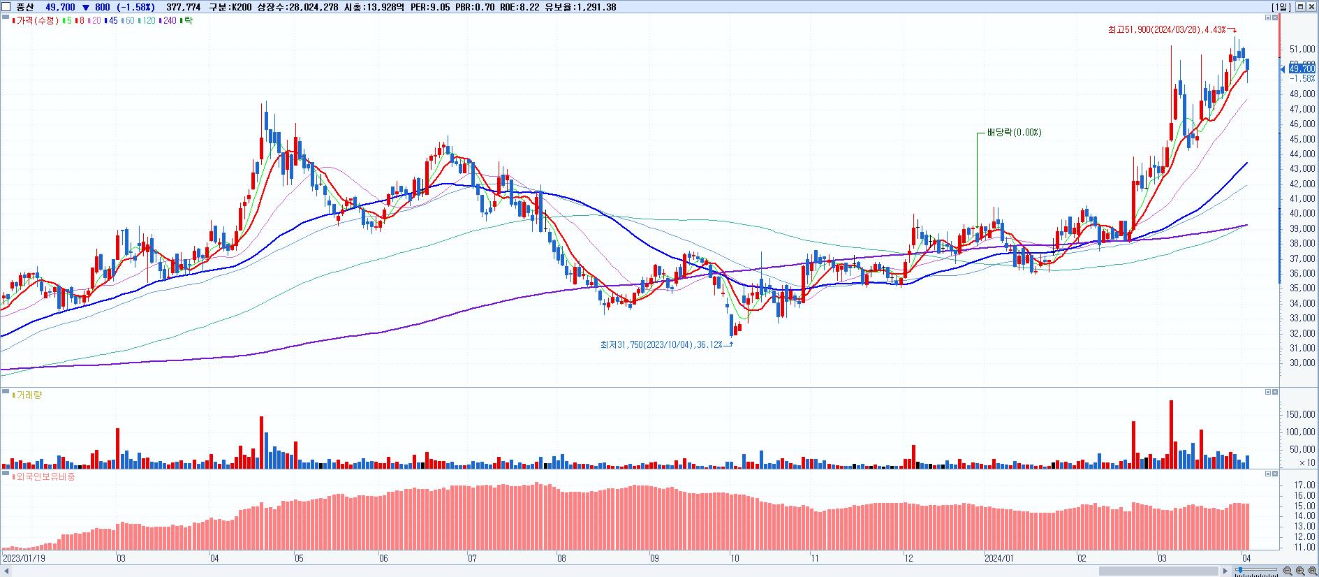 - 풍산 (49,700원 ▼ -1.58% , 시총: 13,928억, 외국인 순매수 거래금:55억)