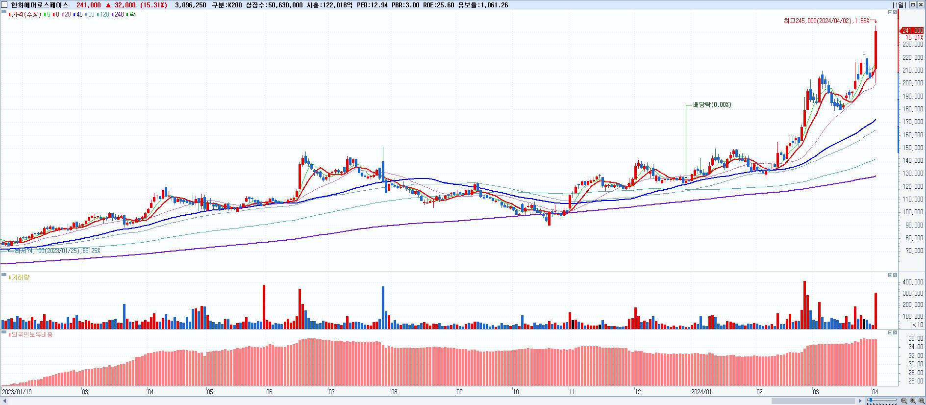 - 한화에어로스페이스 (241,000원 ▲ 15.31% , 시총: 122,018억, 외국인 순매수 거래금:244억)