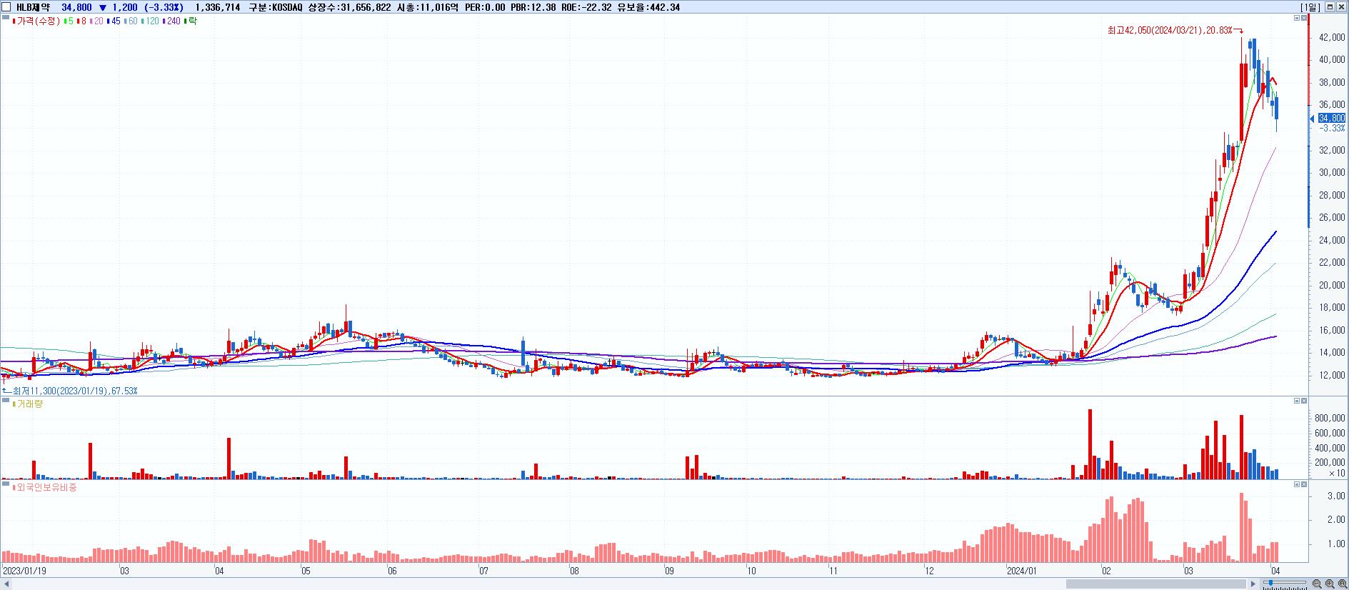 - HLB제약 (34,800원 ▼ -3.33% , 시총: 11,017억, 외국인 순매수 거래금:62억)