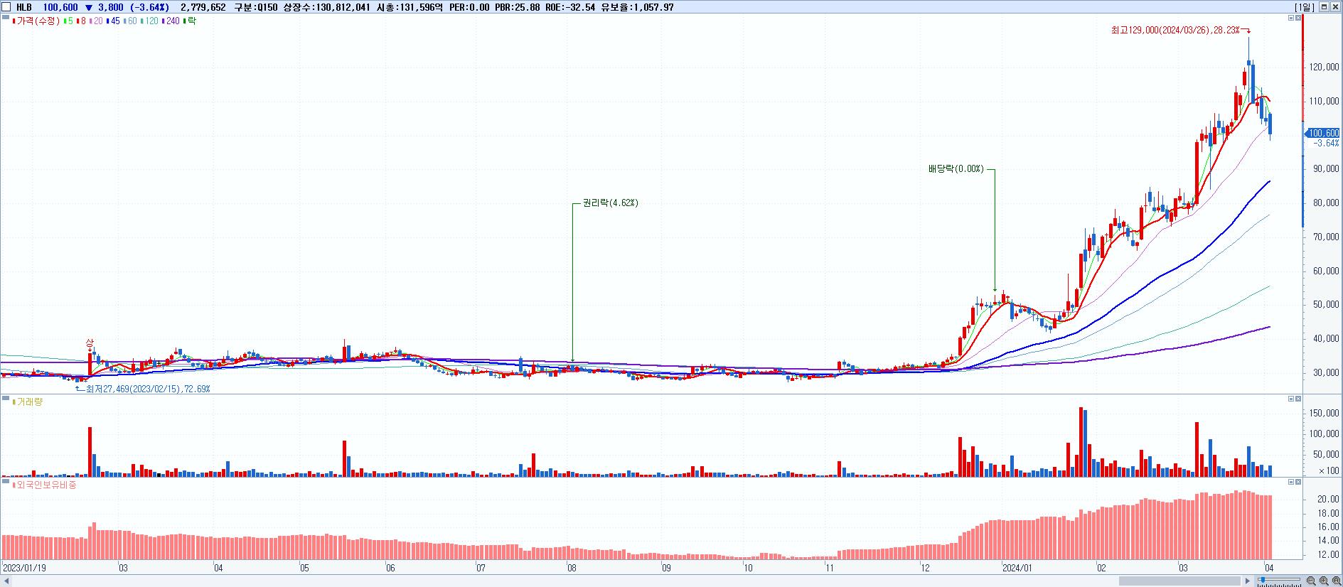 - HLB (100,600원 ▼ -3.64% , 시총: 131,597억, 외국인 순매수 거래금:164억)