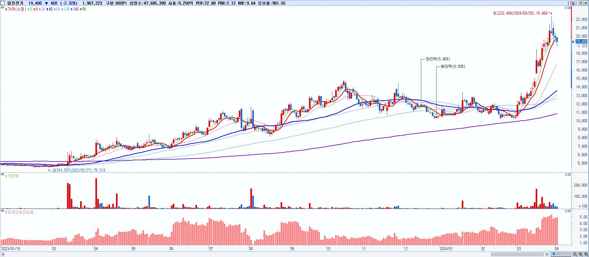 - 일진전기 (19,400원 ▼ -2.32% , 시총: 9,251억, 외국인 순매수 거래금:61억)