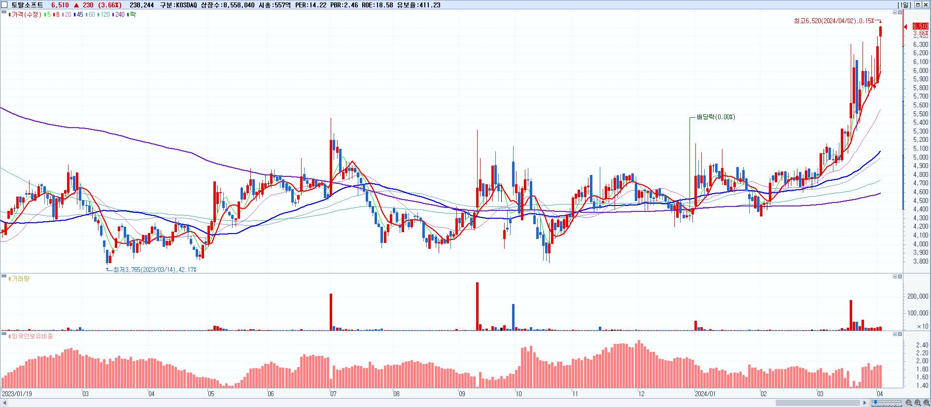 - 토탈소프트 (6,510원 ▲ 3.66% , 시총: 557억, 거래량: 238,244, 거래대금:15억, KOSDAQ)