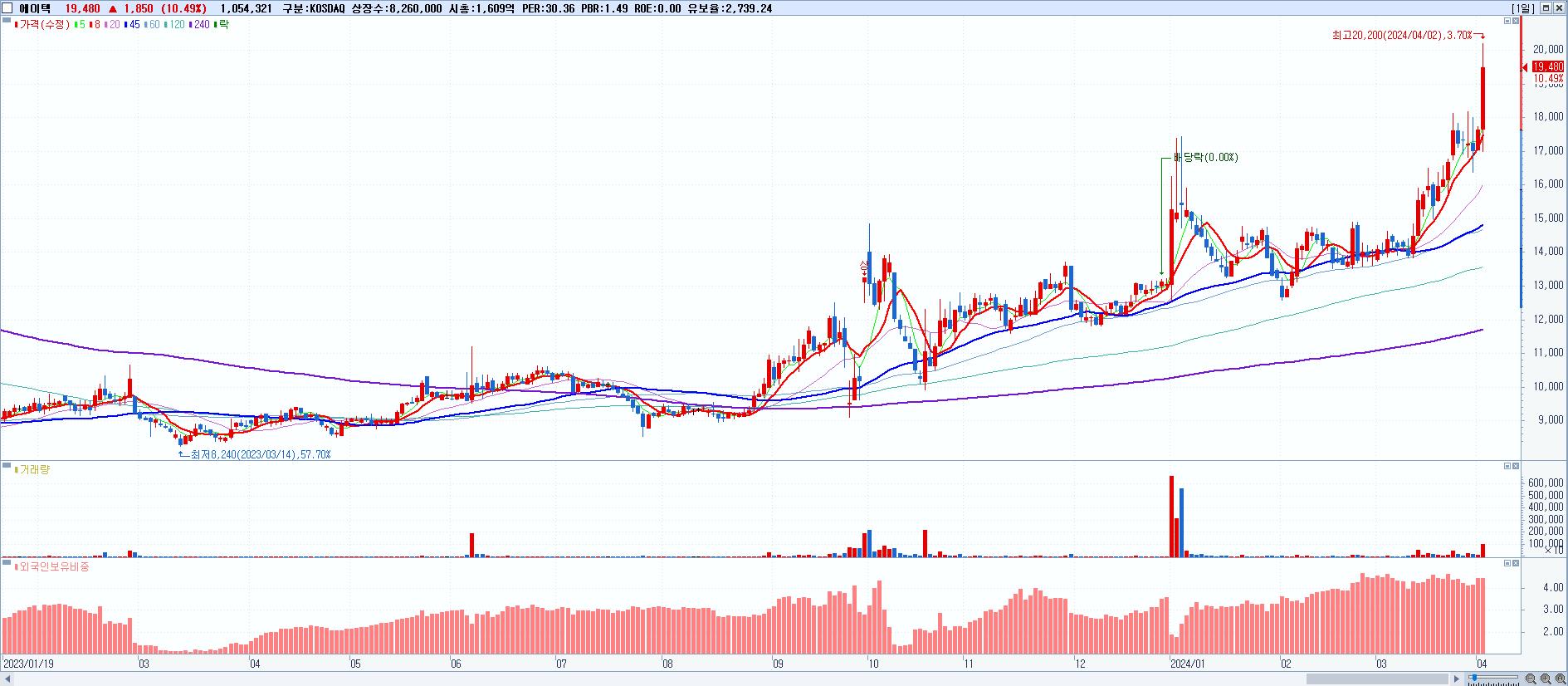 - 에이텍 (19,480원 ▲ 10.49% , 시총: 1,609억, 거래량: 1,054,321, 거래대금:199억, KOSDAQ)