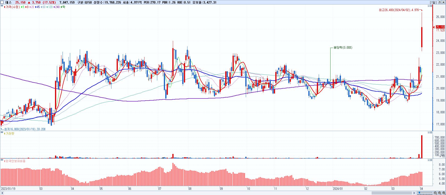 테스 25,150원 ▲ 17.52% (KOSDAQ, 095610)