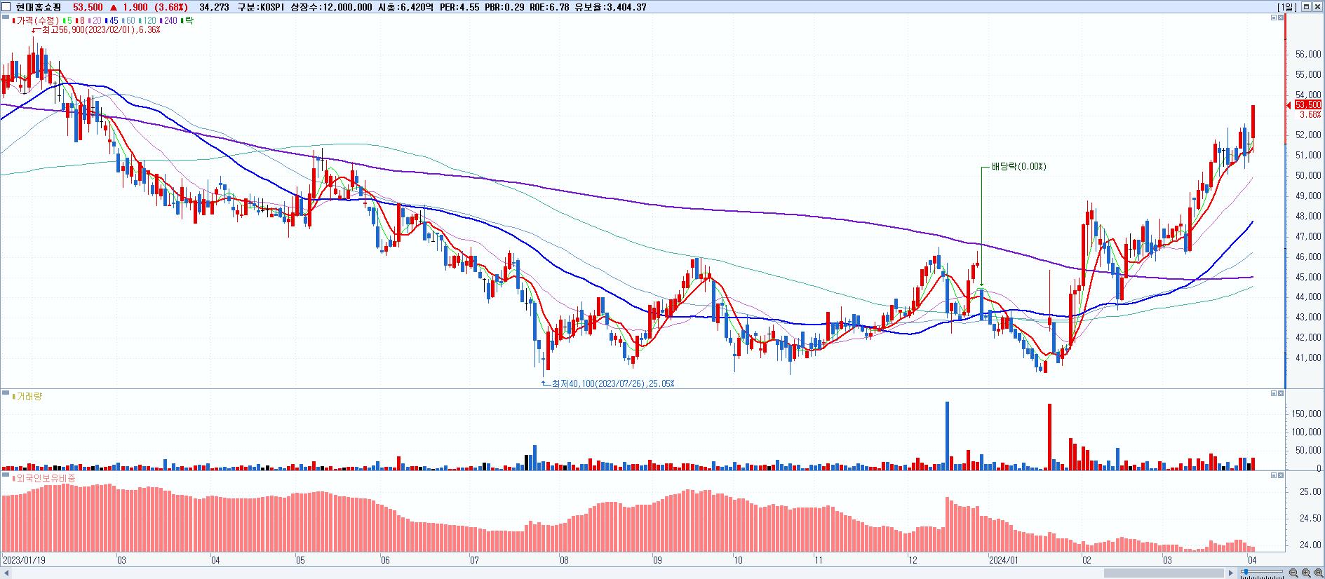 - 현대홈쇼핑 (53,500원 ▲ 3.68% , 시총: 6,420억, 거래량: 34,273, 거래대금:18억, KOSPI)