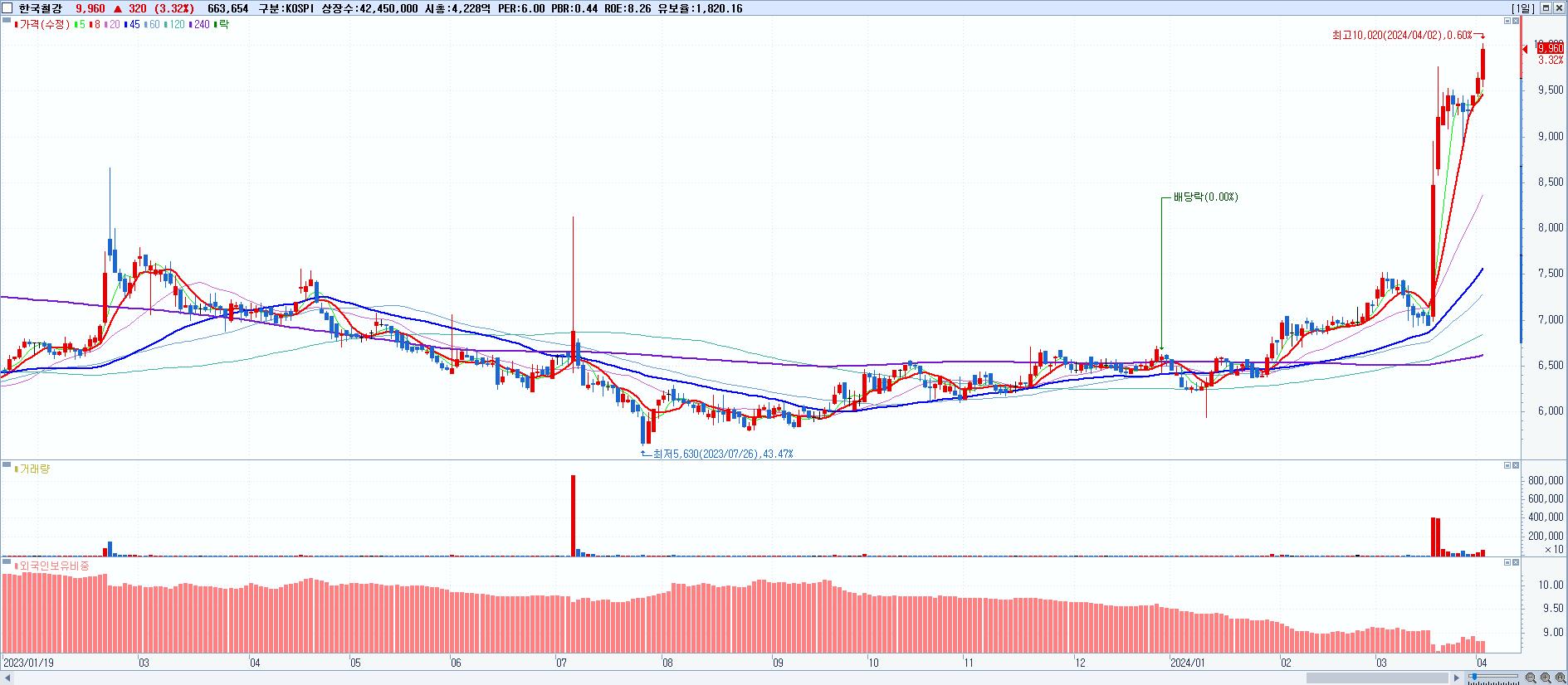 한국철강 9,960원 ▲ 3.32% (KOSPI, 104700)