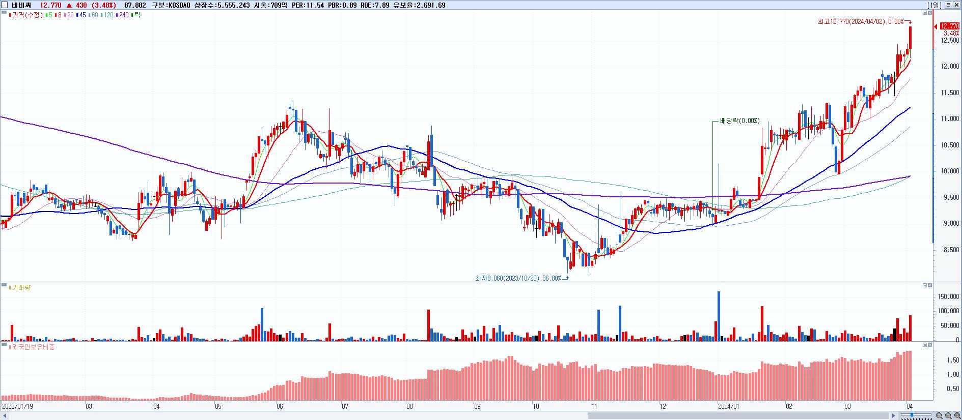 - 비비씨 (12,770원 ▲ 3.48% , 시총: 709억, 거래량: 87,882, 거래대금:11억, KOSDAQ)