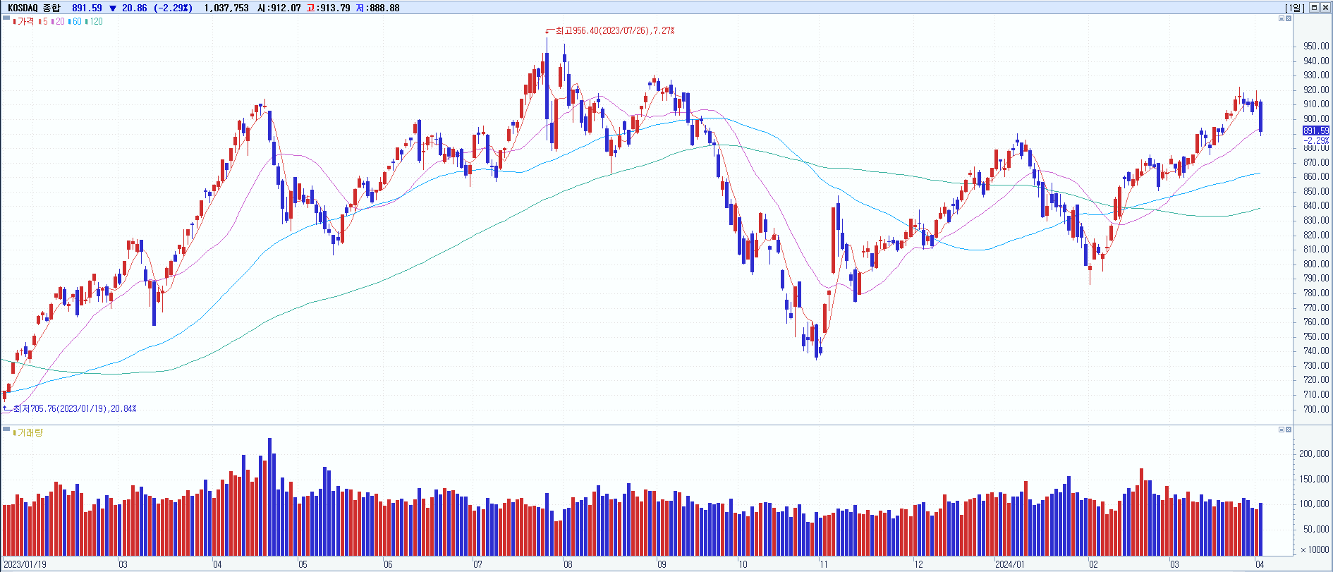 | 04/02 | 891.59 | ▼-2.29% | 4,769억 | -2,284억 | -2,370억 | -115억 |