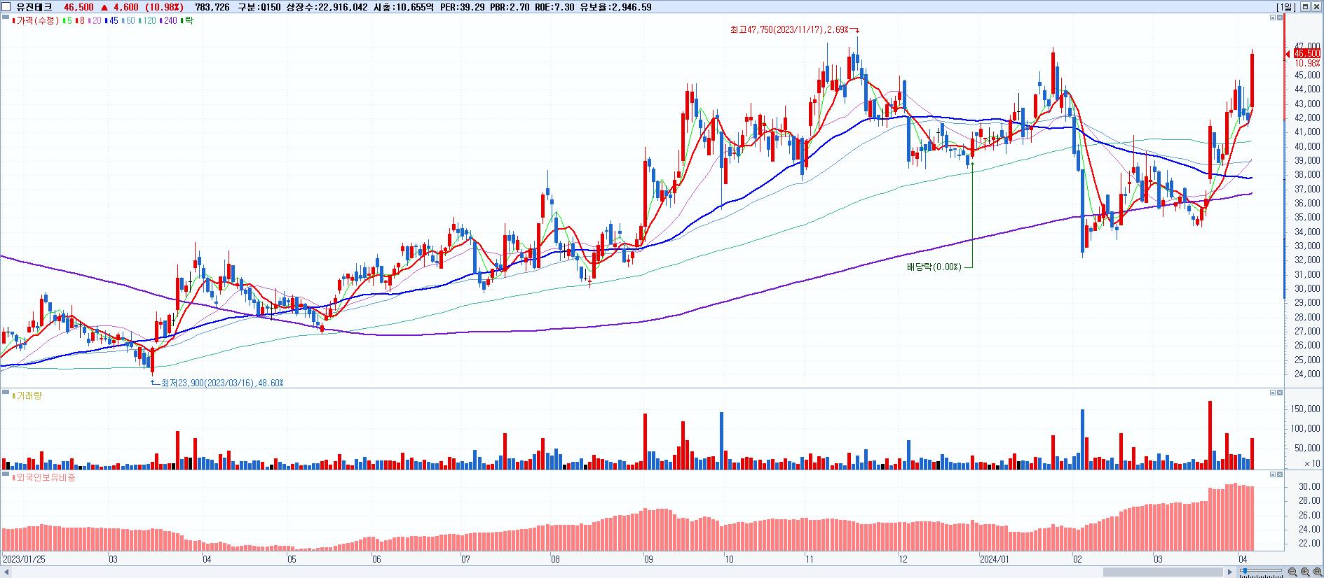 29.유진테크 46,500원 ▲ 10.98% (KOSDAQ, 084370)