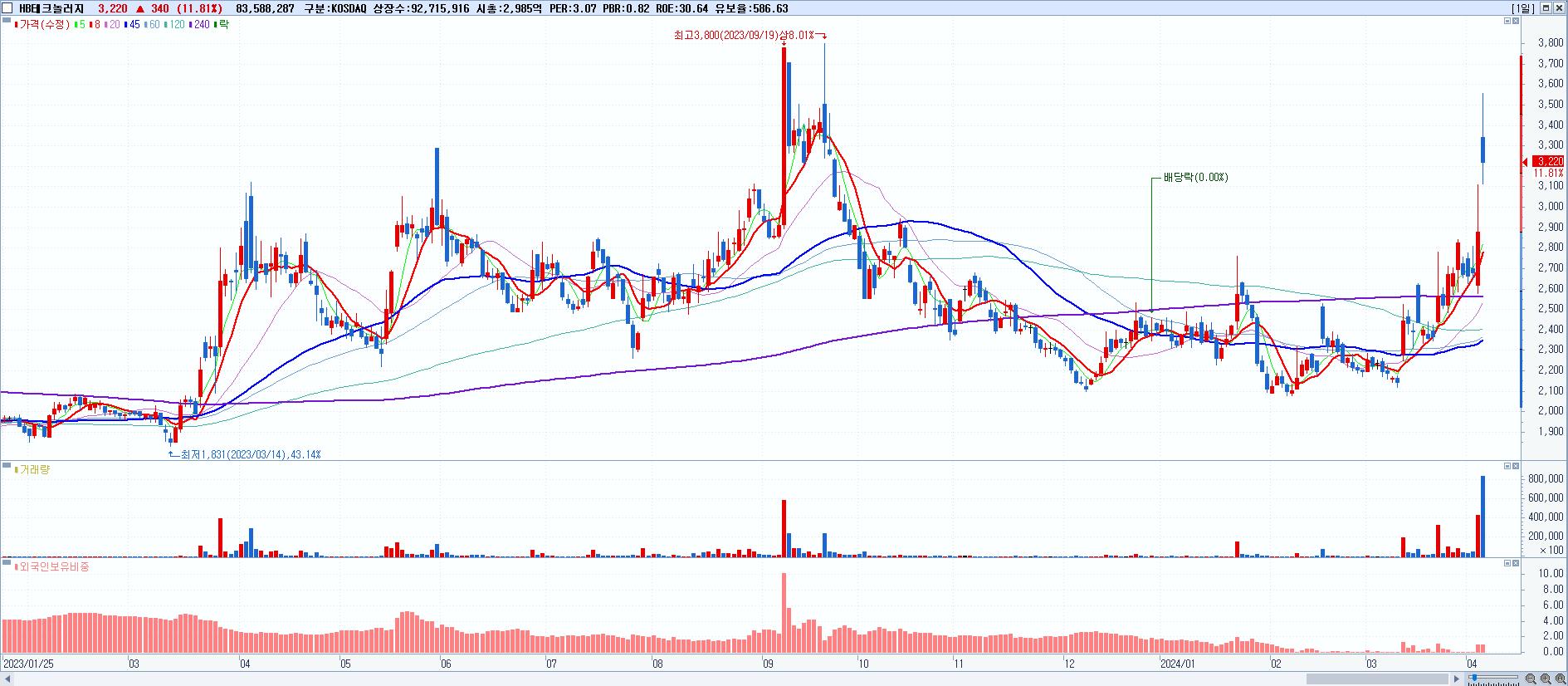 - HB테크놀러지 (3,220원 ▲ 11.81% , 시총: 2,985억, 거래량: 83,588,287, 거래대금:2,779억)