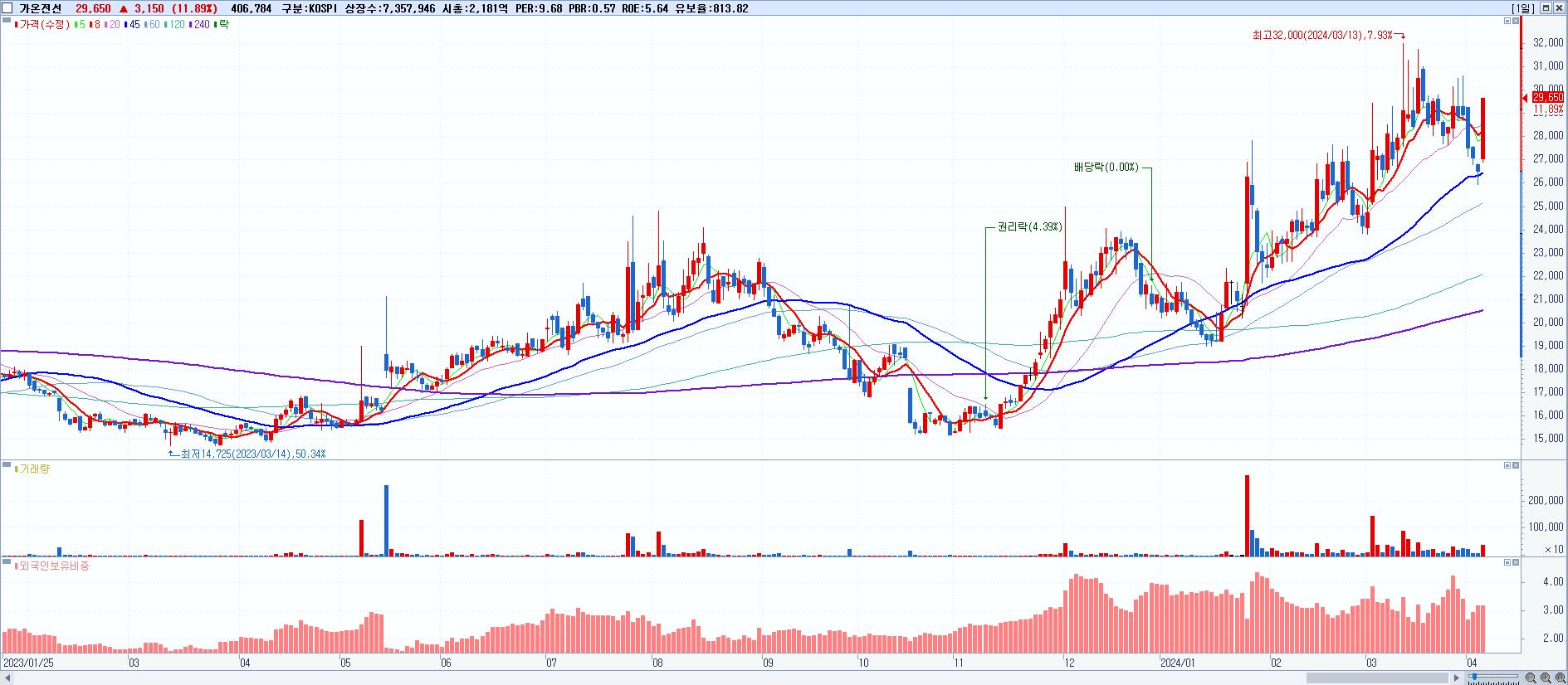 - 가온전선 (29,650원 ▲ 11.89% , 시총: 2,182억, 거래량: 406,784, 거래대금:116억)