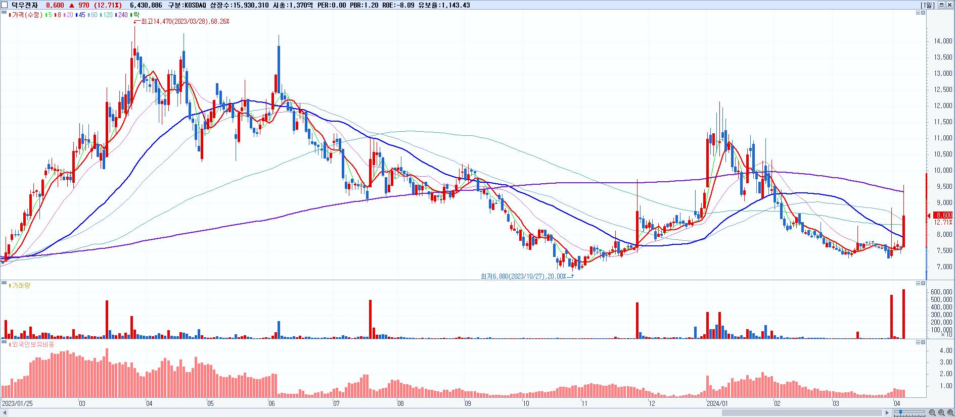 - 덕우전자 (8,600원 ▲ 12.71% , 시총: 1,370억, 거래량: 6,430,886, 거래대금:572억)