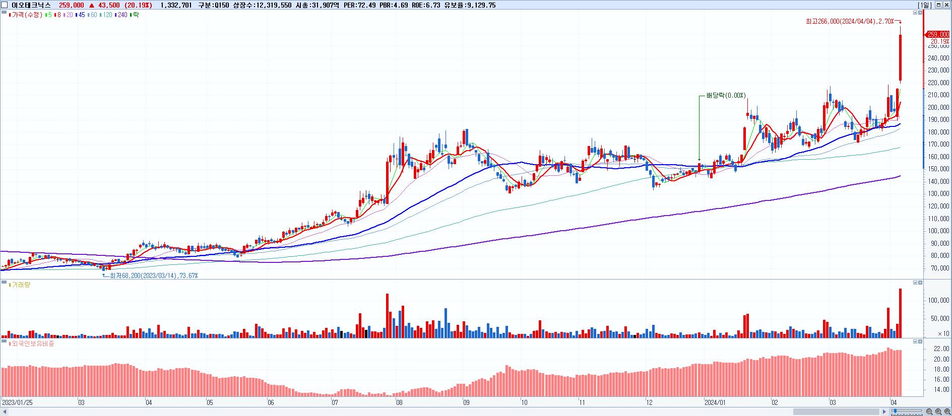 - 이오테크닉스 (259,000원 ▲ 20.19% , 시총: 31,908억, 거래량: 1,332,701, 거래대금:3,288억)