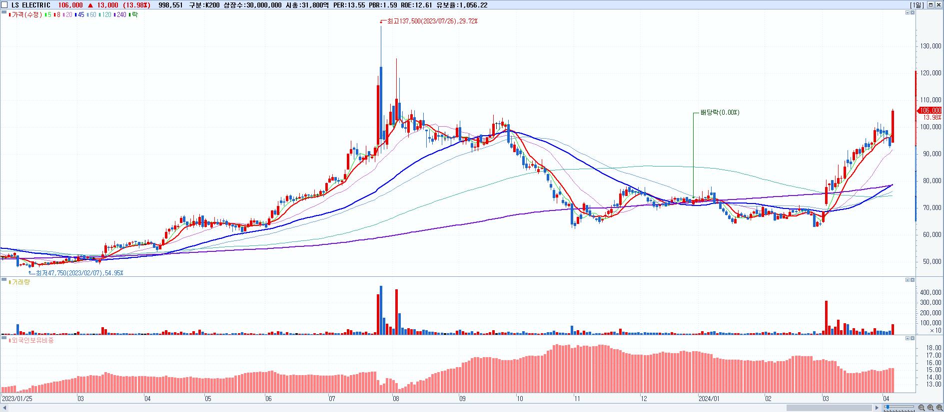 - LS ELECTRIC (106,000원 ▲ 13.98% , 시총: 31,800억, 거래량: 998,551, 거래대금:1,015억)