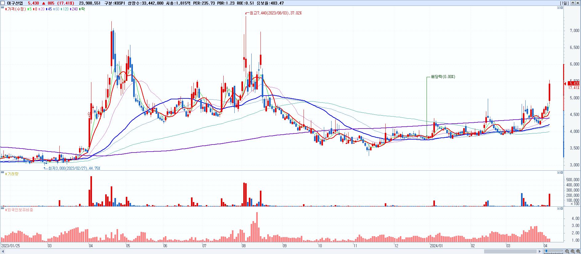 - 이구산업 (5,430원 ▲ 17.41% , 시총: 1,816억, 거래량: 23,908,551, 거래대금:1,275억)