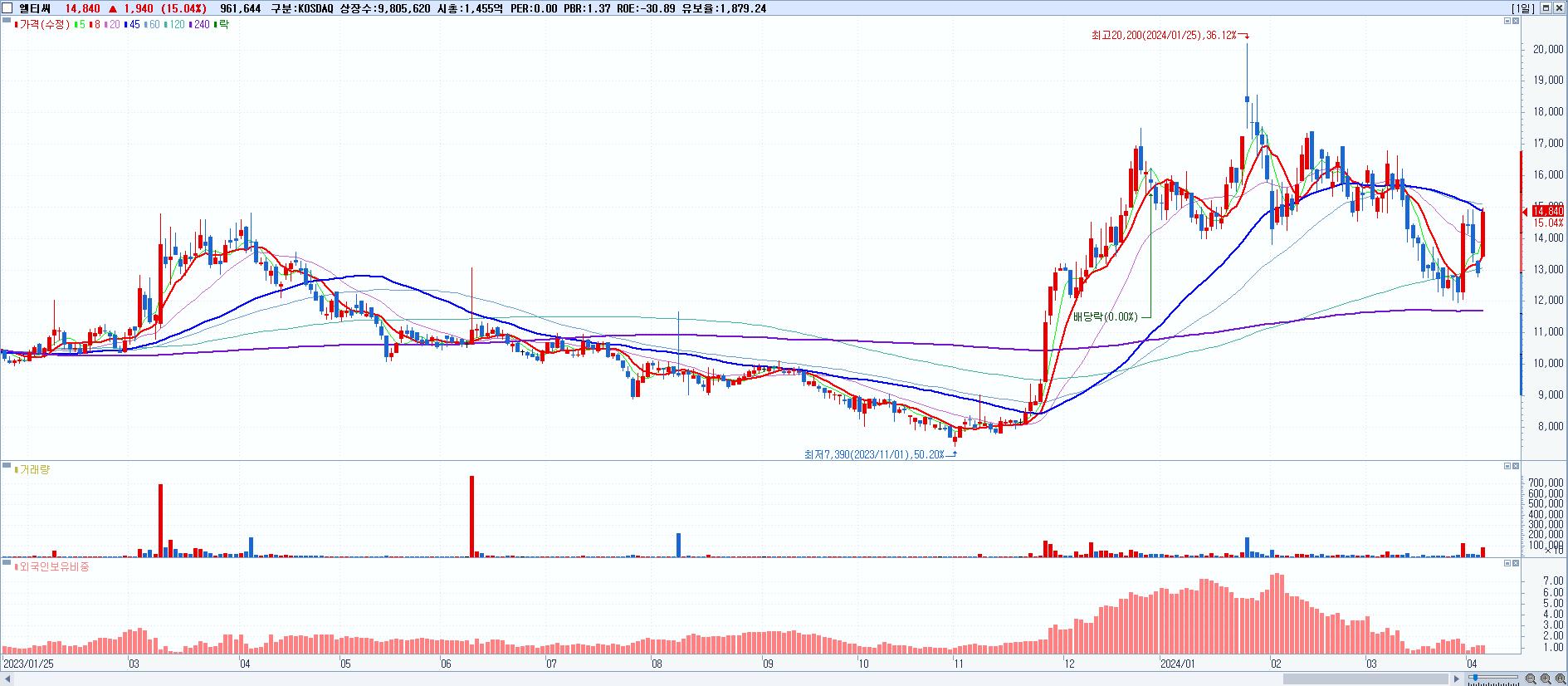 - 엠젠솔루션 (2,245원 ▲ 17.79% , 시총: 937억, 거래량: 4,907,727, 거래대금:120억)
