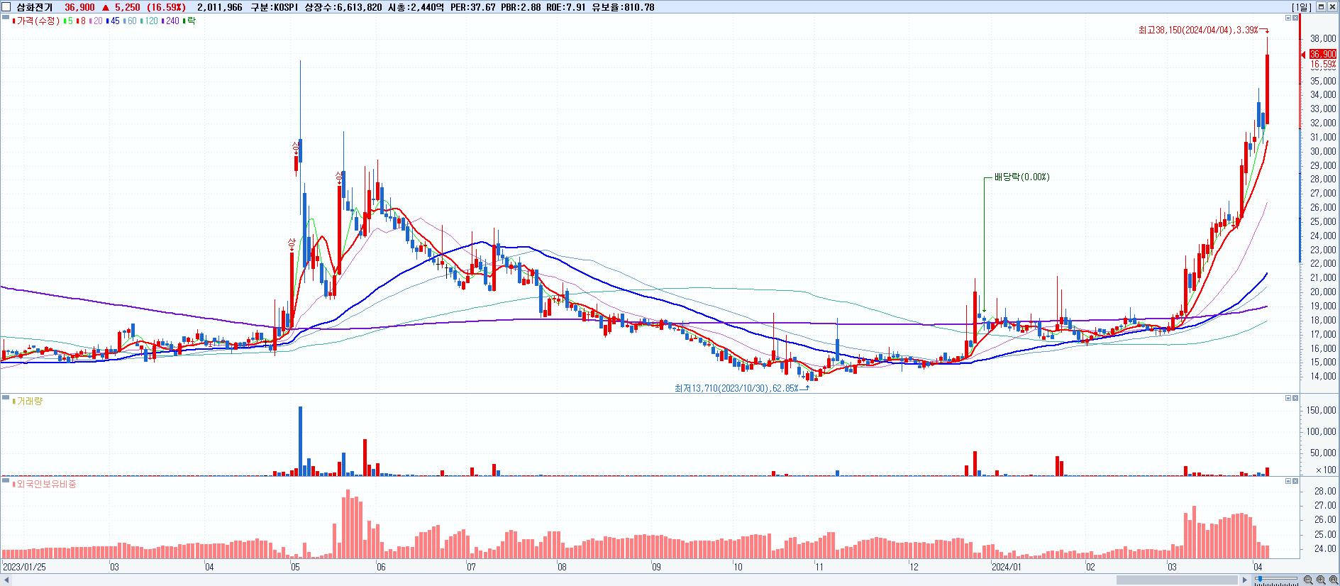 - 삼화전기 (36,900원 ▲ 16.59% , 시총: 2,440억, 거래량: 2,011,966, 거래대금:717억)