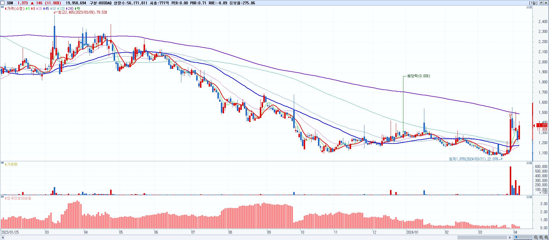 - SDN (1,373원 ▲ 11.9% , 시총: 771억, 거래량: 19,958,694, 거래대금:271억)