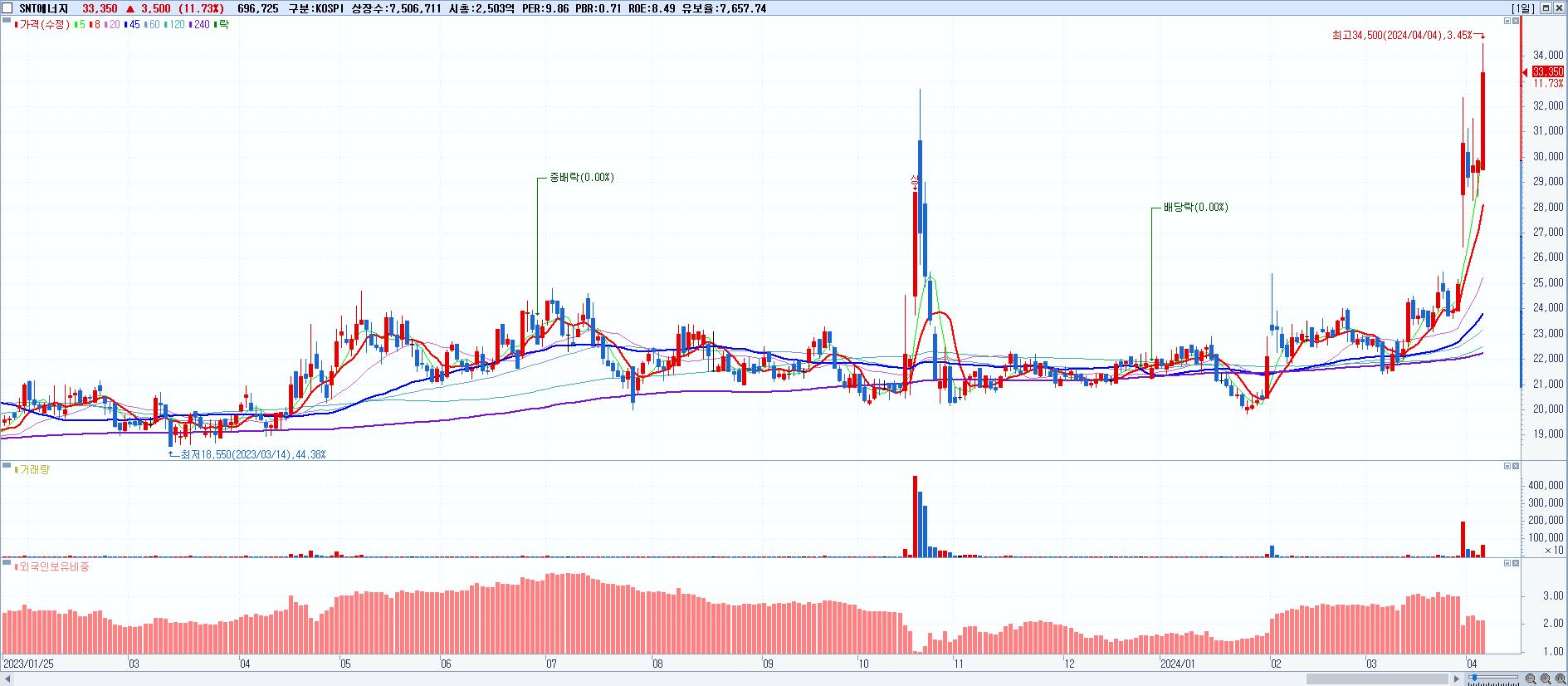 - SNT에너지 (33,350원 ▲ 11.73% , 시총: 2,503억, 거래량: 696,725, 거래대금:226억)