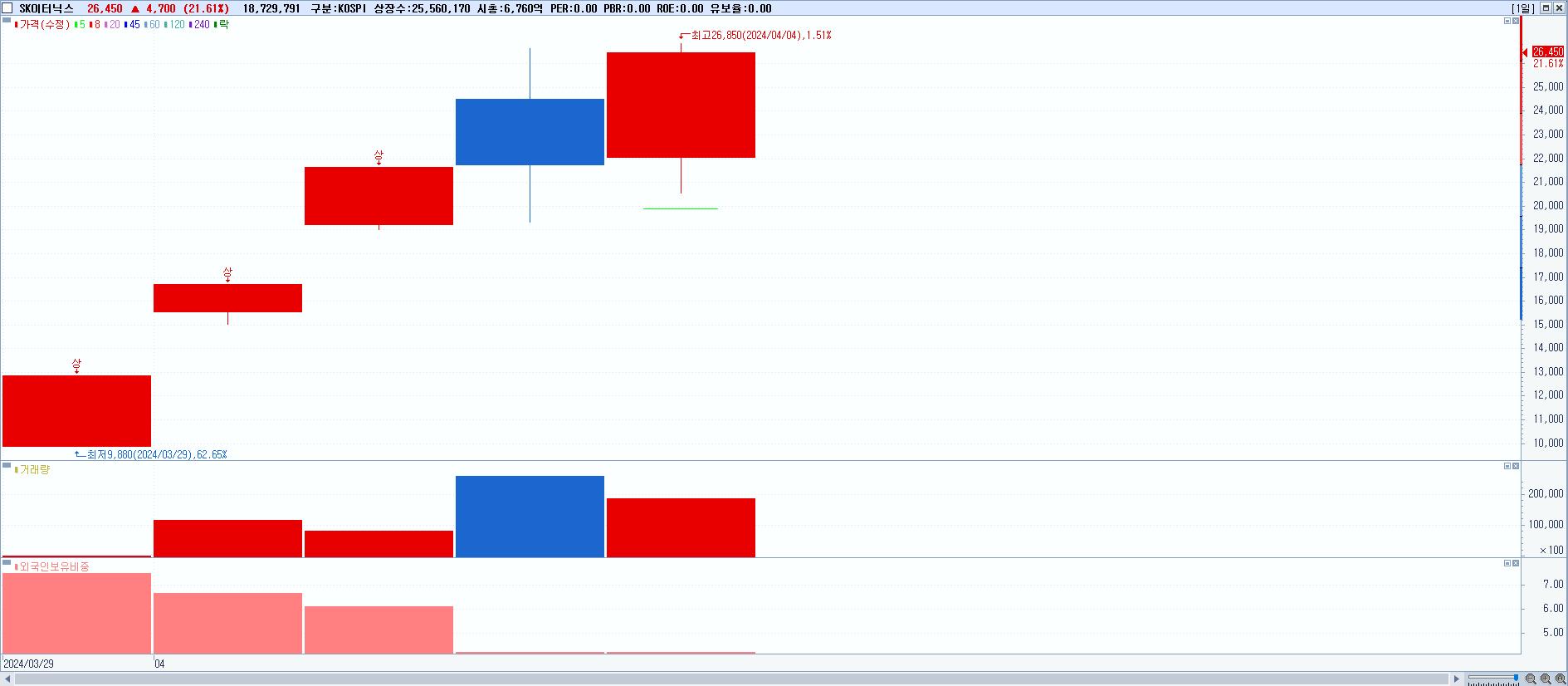 - SK이터닉스 (26,450원 ▲ 21.61% , 시총: 6,761억, 거래량: 18,729,791, 거래대금:4,393억)