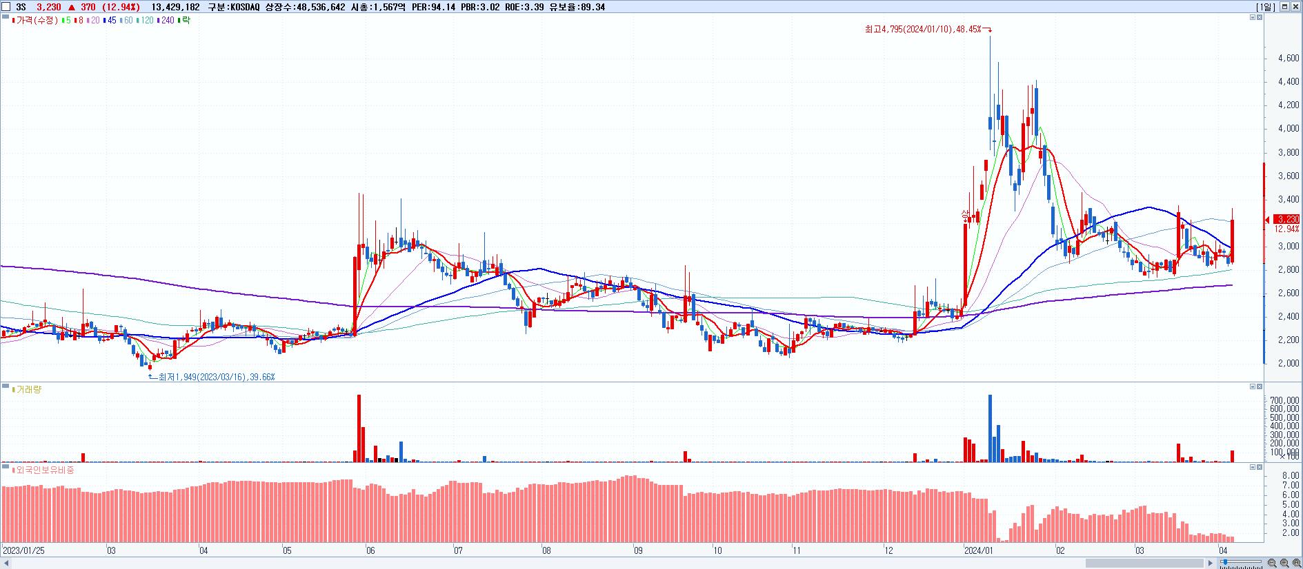 - 3S (3,230원 ▲ 12.94% , 시총: 1,568억, 거래량: 13,429,182, 거래대금:428억)