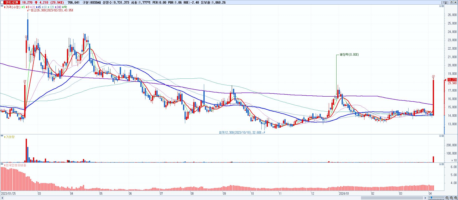 - 안트로젠 (18,270원 ▲ 29.94% , 시총: 1,778억, 거래량: 706,641, 거래대금:126억)