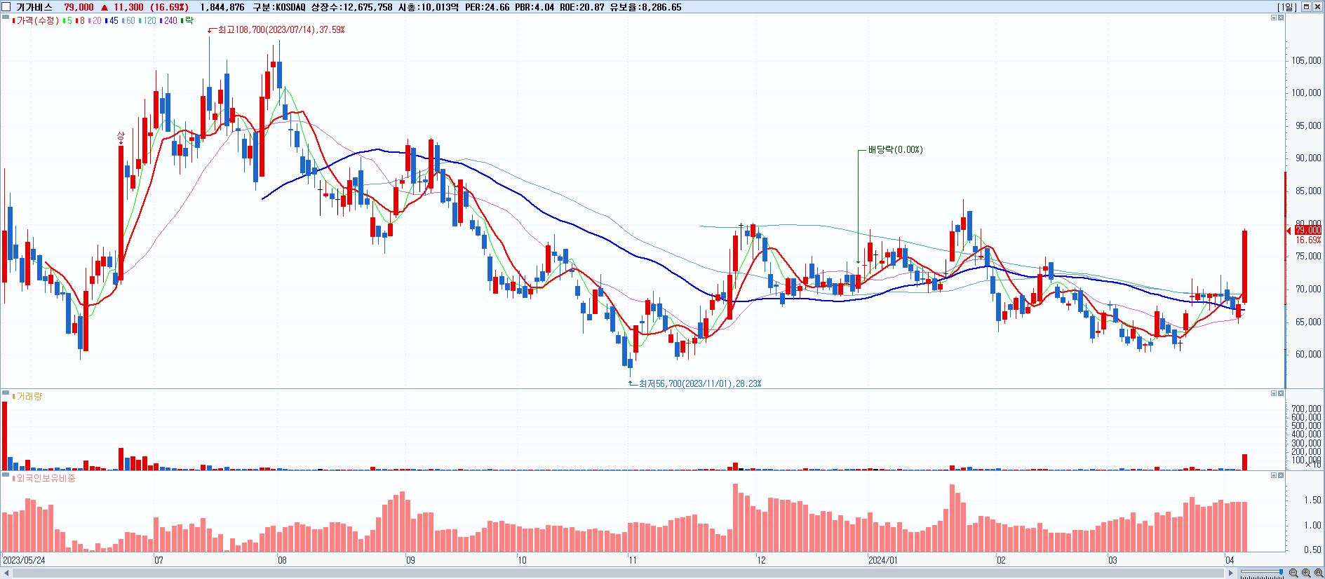 - 기가비스 (79,000원 ▲ 16.69% , 시총: 10,014억, 거래량: 1,844,876, 거래대금:1,394억)
